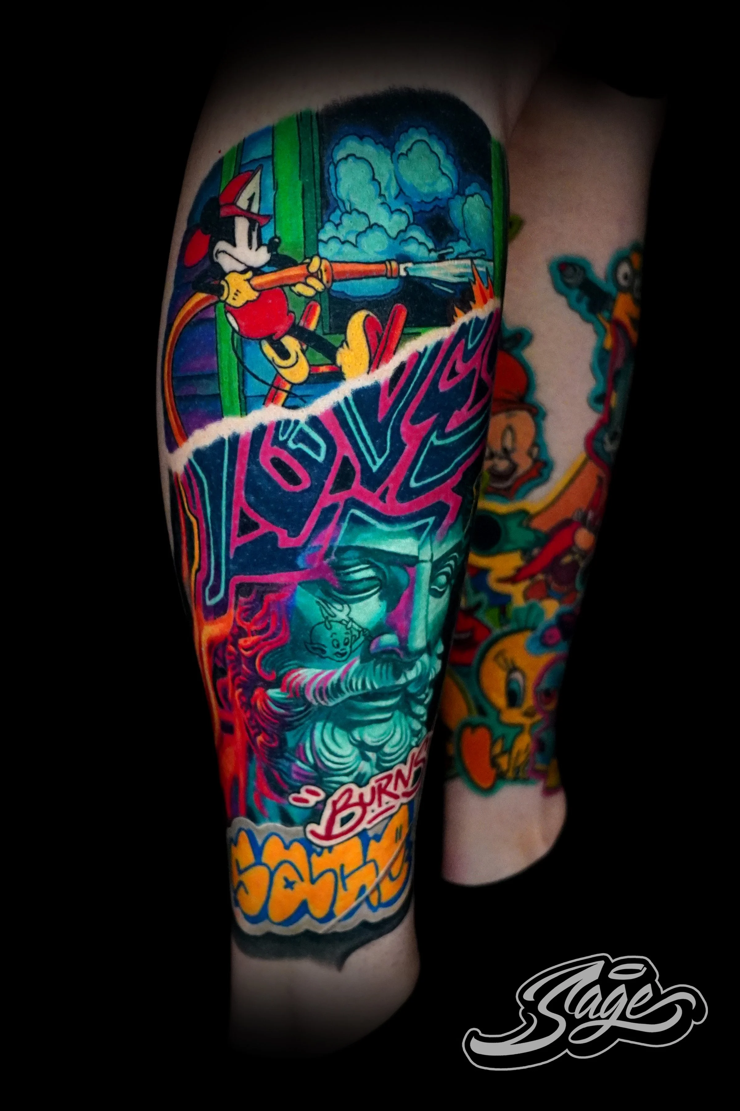 Sage’s work is a vibrant fusion of influences. He draws inspiration from the elegance of academic painting, the bold and dynamic energy of Miami's street art, the playful innocence of the cartoons he loved as a child, and the ever-evolving world of pop culture. The edge and intensity of the tattoo world also play a crucial role in shaping his art.